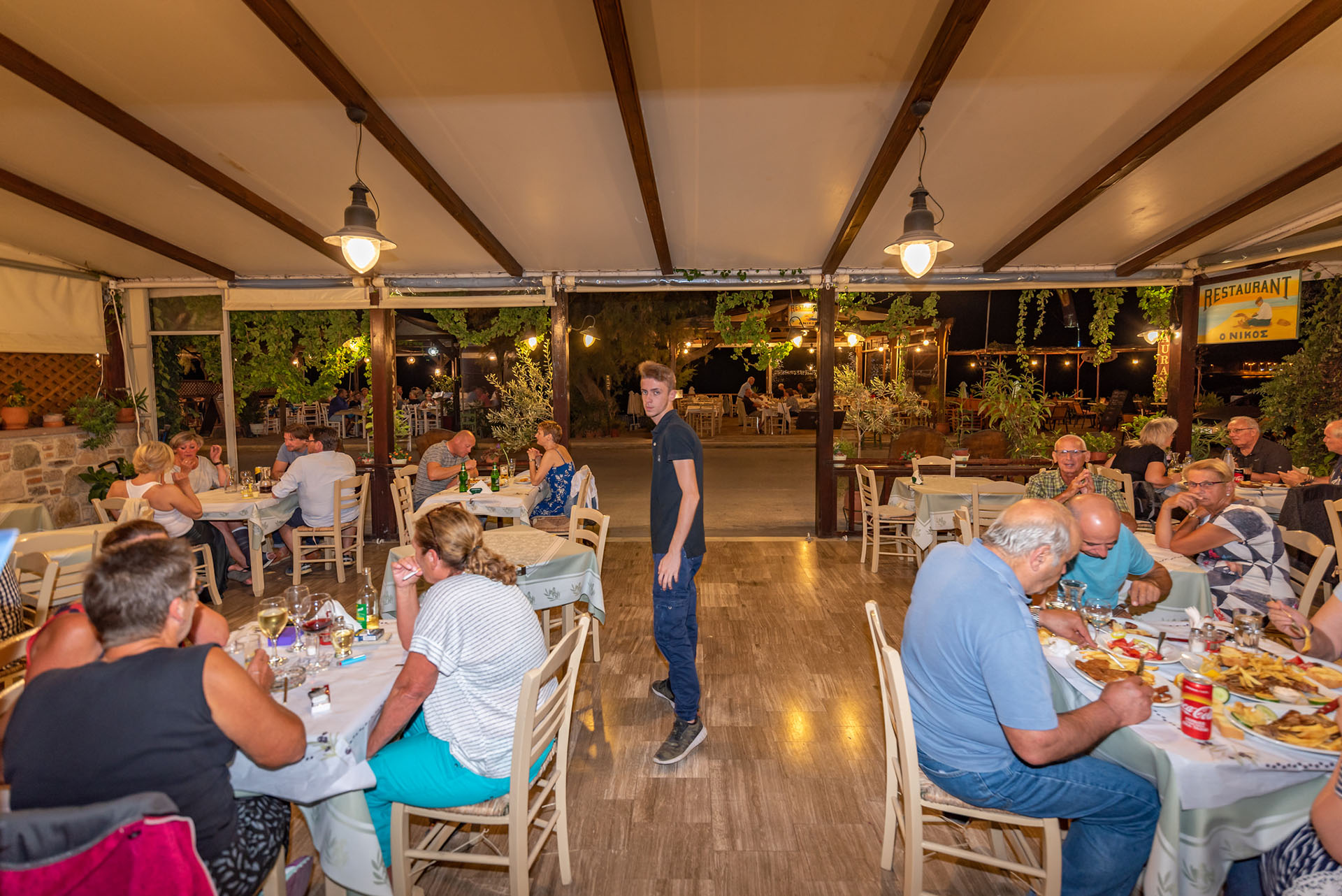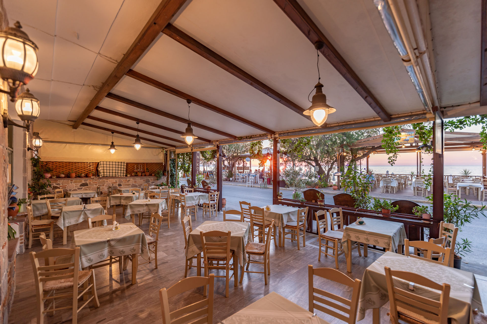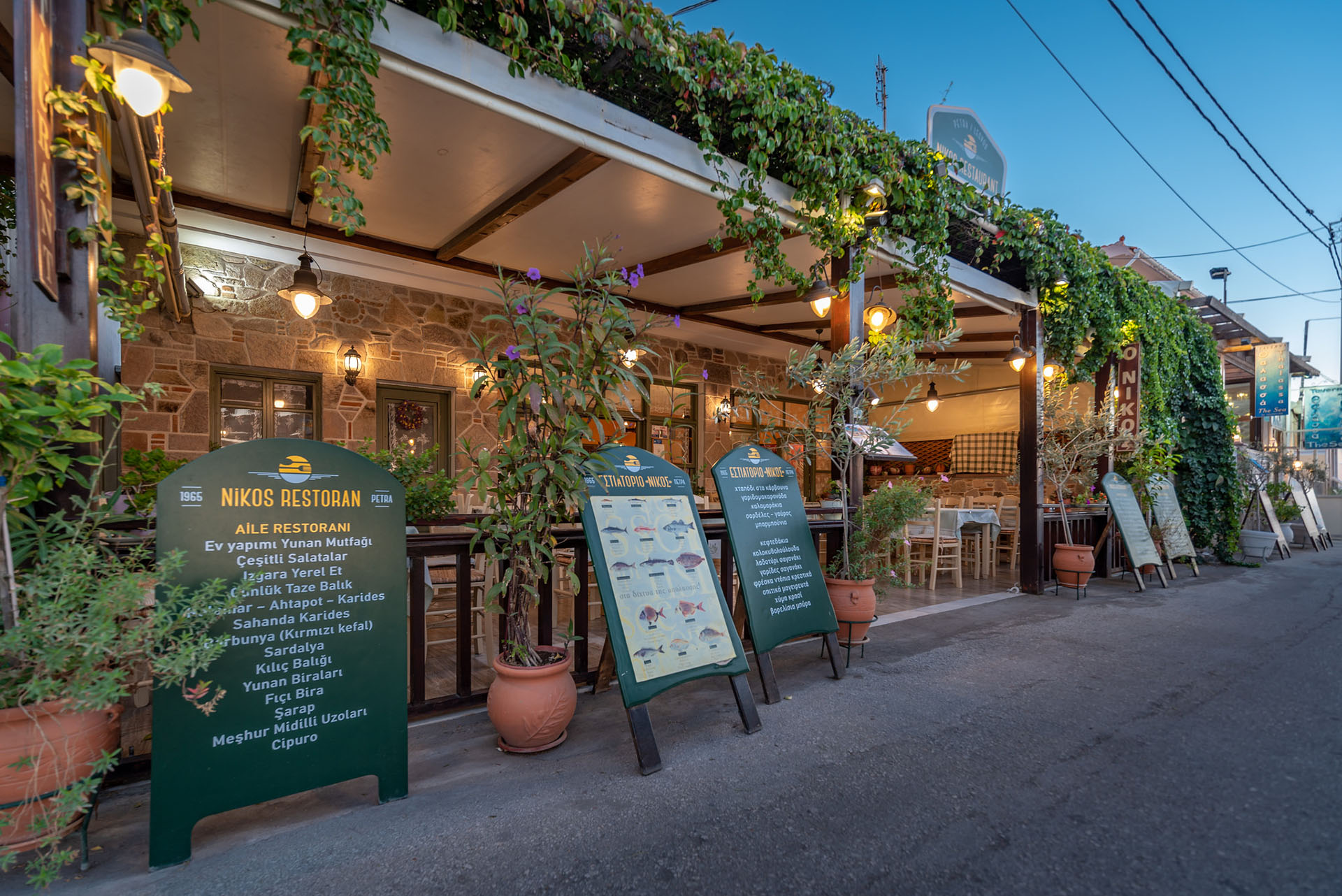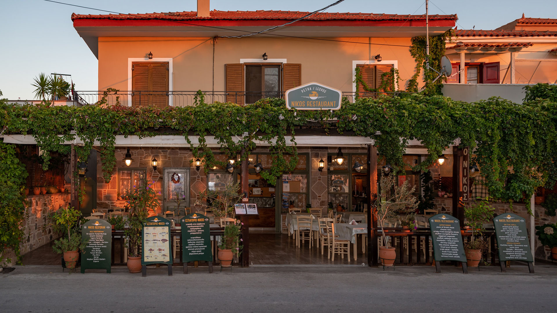 "Nikos" Restaurant is a family restaurant;the first that was established in Petra, Lesvos, operating since 1965. There are four generations in our family: Giannis, Soula, Eleni, Nikos and young Nikos. Our restaurant delivers traditional homemade Greek cuisine, with a great variety of starters and a good choice of local wines and worldwide famous ouzo from Lesvos. Our meat and seasonal vegetables are sourced locally and our fish could not be more fresh, harvested daily from our shores.